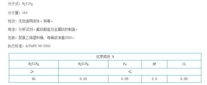 分子式:H2TiF6分子量:164性狀:無(wú)色透明液體。有毒。用途:分析試劑。氟鈦酸鹽及金屬鈦的制造。...
