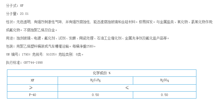 分子式:HF分子量:20.01性狀:無(wú)色透明, 有強烈刺激性氣味, 并有強烈腐蝕性, 能迅速腐蝕玻璃和含硅材料。極易揮發(fā)。與金屬鹽類(lèi)、氧化物、氫氧化物作用生成氟化物。不腐蝕聚乙烯及白金...